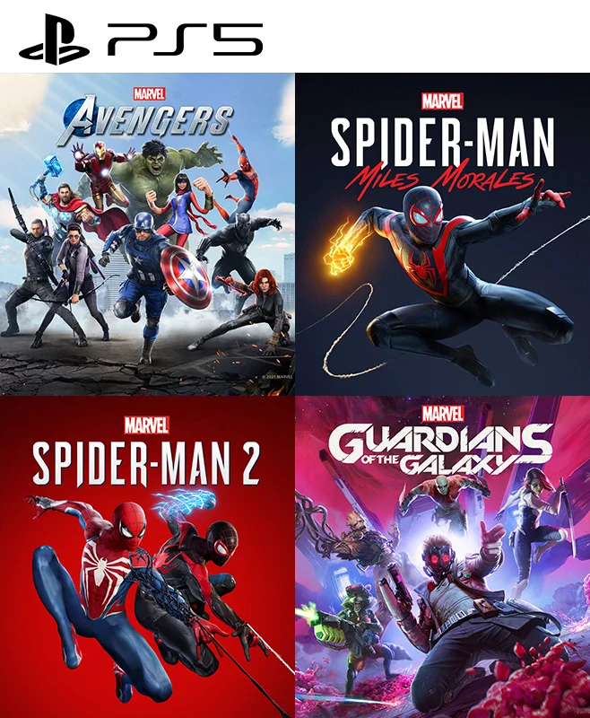 El pack incluye: - Marvel's Spider-Man: Miles Morales PS5 - MARVEL'S SPIDER MAN 2 PS5 - Marvel's Guardians of the Galaxy PS5 - Marvels Avengers PS5 Pesos de los juegos : 300 GB Instalación : 1 consola