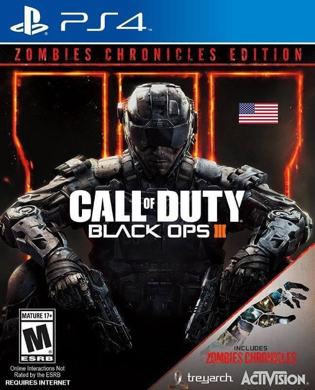 Voces: Inglés Textos: Inglés Peso del Juego : 59.1 GB Requerido en Consola : 118.2 GB Libres. Instalación : Hasta 1 consola CONTENIDO: - CALL OF DUTY BLACK OPS III - DLC Zombies Chronicles - 8 mapas clásicos de Zombis remasterizados de la saga original*